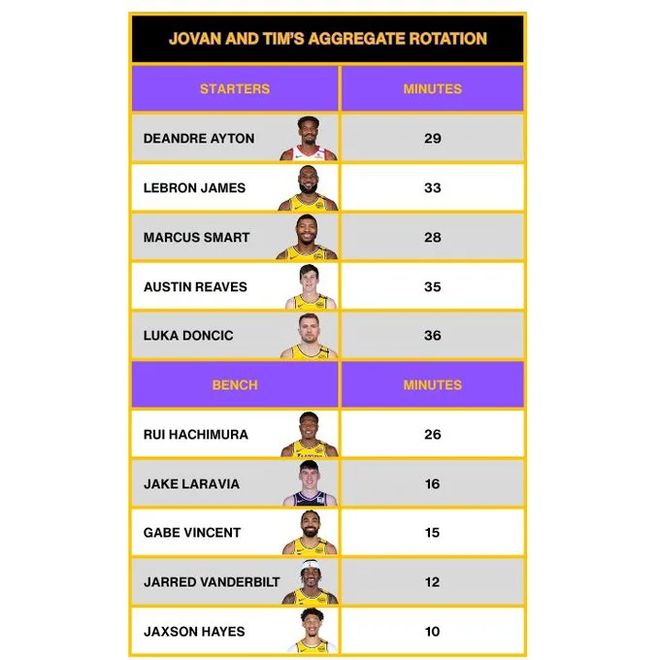 昨日,根據ESPN媒體報道,湖人預計會在明年夏天為里夫斯提供一份年薪3000萬的續約合同,以讓其長期跟東契奇搭檔,自此,湖人這個休賽期的操作,以及未來的核心搭建框架基本確定,球迷們在這個夏天所關心的問題也基本給出了答案,現在唯一的問題就是,湖人在新賽季的陣容輪換到底應該是什么樣的?對此,NBA記者Jovan Buha更新社交媒體,曬出對于湖人新賽季輪換時間的預測。